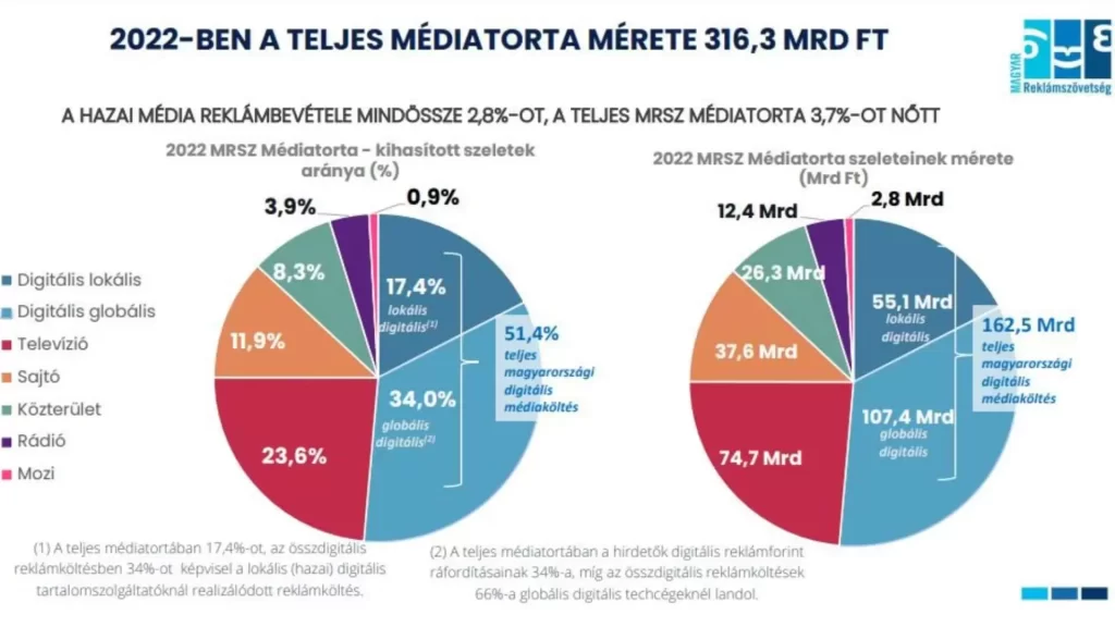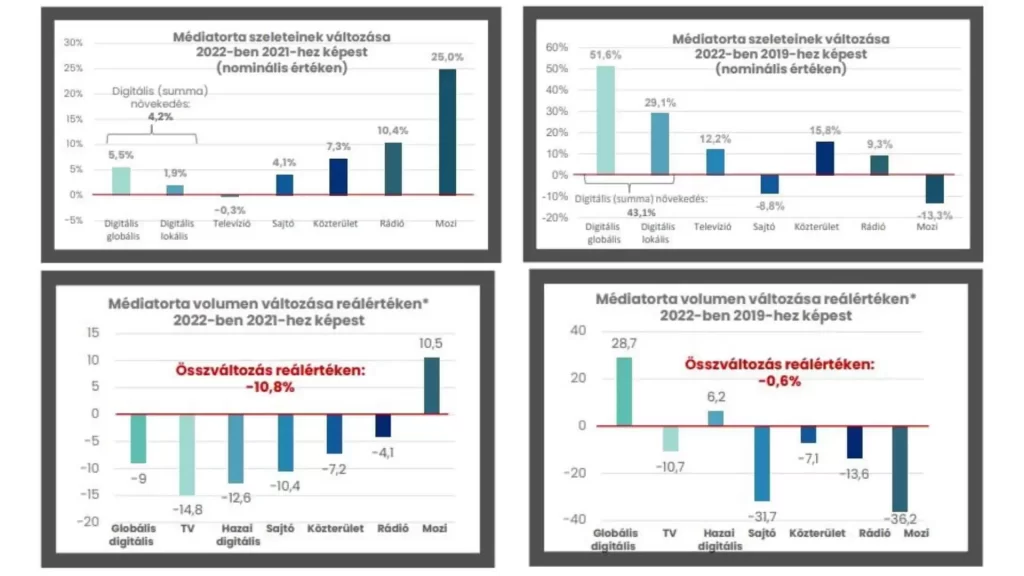 Az elmúlt év teljes médiatortája 316,3 milliárd forint, vagyis a média reklámbevételei látszólagosan nőttek, 3,7%-kal magasabb szintet érve el a 2021-es évhez képest. Azonban a magas infláció hatására a reálértékben mért növekedés elmaradt az elvárttól és a reklámbevételek tizedével (10,8%-kal) csökkentek.